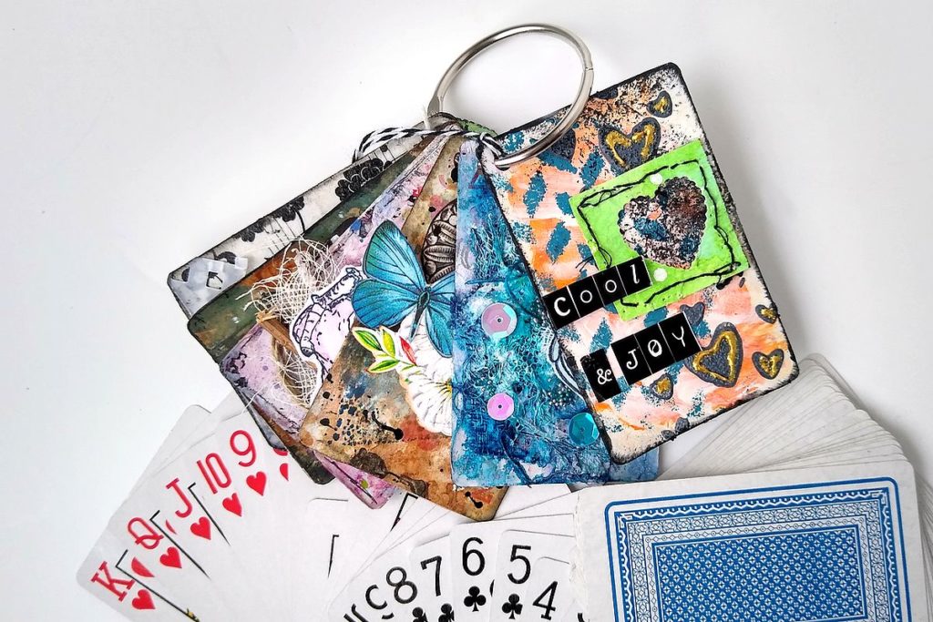 Tematem ,,kart do gry,, interesuję się od jakiegoś czasu ale bardziej w stronę ATC. Mam 3 talie normalne i jedną mini (też za grosze). Tymi wymiarowymi wzmacniałam karty ATC , teraz wykorzystuję kartę jako tło do ateciaków (ma być widać, że to karta). Wczoraj kawałki gazety do kart przykleiłam a dzisiaj gazety łatwo odeszły bo …… karty śliskie. Dziękuję za podpowiedź co jeszcze zrobić z tą śliskością (ja papierem ściernym przetarłam, teraz gazeta powinna się przykleić). Zaltretować cały komplet kart? Chyba jednak nie bo …… nie jestem aż tak systematyczna. Dziękuję za linki 🙂 Powodzenia w wykorzystaniu całej talii ….. kurcze, podobają mi się i takie zawieszone na kółku kusząco wyglądają.