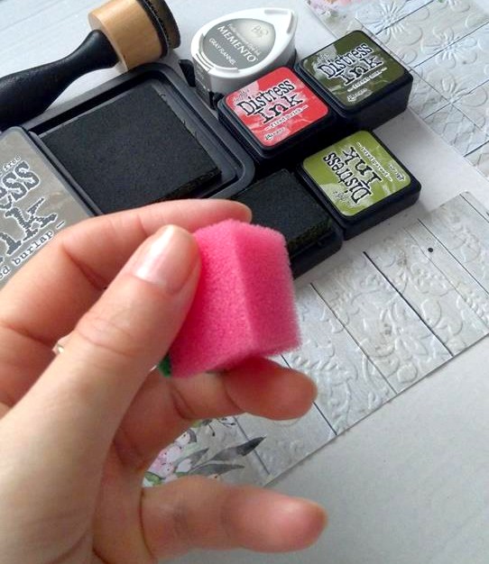 Wytłoczony papier pokrywam cieniutką warstwą tuszu, którego odrobinę nabieram na kawałek gąbki.